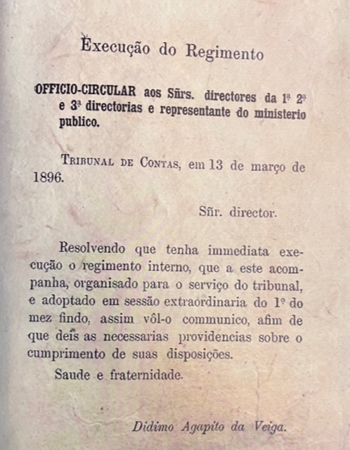 Em 1893, mediante a indicação do ministro da Fazenda, Serzedello Corrêa, Dídimo Agapito da Veiga foi designado como diretor do Tribunal de Contas, assumindo a honrosa responsabilidade de representar o Ministério Público junto à instituição. Em agosto de 1894, ele foi então nomeado presidente, desempenhando um papel fundamental durante seu mandato. Sob sua liderança, impulsionou uma nova regulamentação para os pareceres das contas governamentais. Além disso, durante seu mandato, foi elaborado e aprovado o primeiro regimento interno, em fevereiro de 1896, que entrou em vigor no mês seguinte. A longa permanência de Dídimo Agapito da Veiga nessa posição o tornou um dos pilares do Tribunal de Contas, cujo legado perdurou por décadas.
